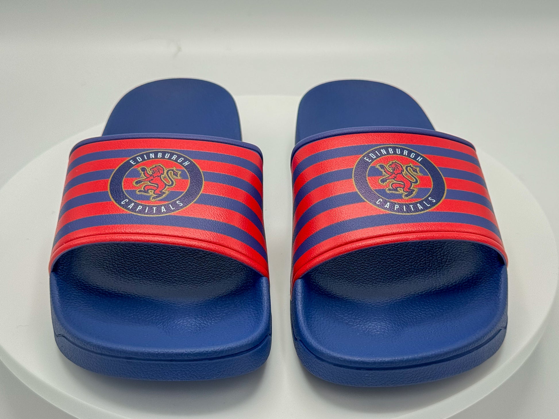 Perfect for players before and after games, holidays, or relaxing at home. These navy sliders feature thick cushioned soles for superior comfort, bold red striping, and the iconic Edinburgh Capitals crest – designed for comfort and team pride, on and off the ice.